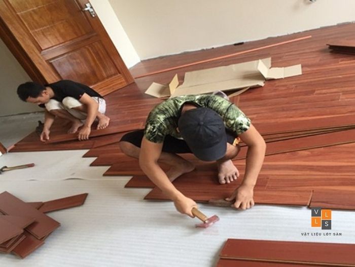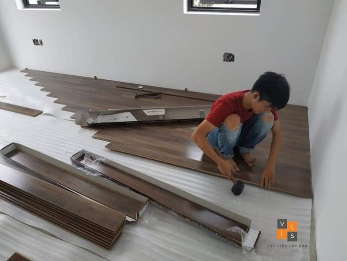 Tiến hành lắp ghép các tấm sàn gỗ theo quy tắc (thường là nối tiếp hoặc xương cá). Các thanh gỗ được liên kết bằng hèm khóa mà không cần dùng keo, giúp việc bảo trì sau này dễ dàng hơn.